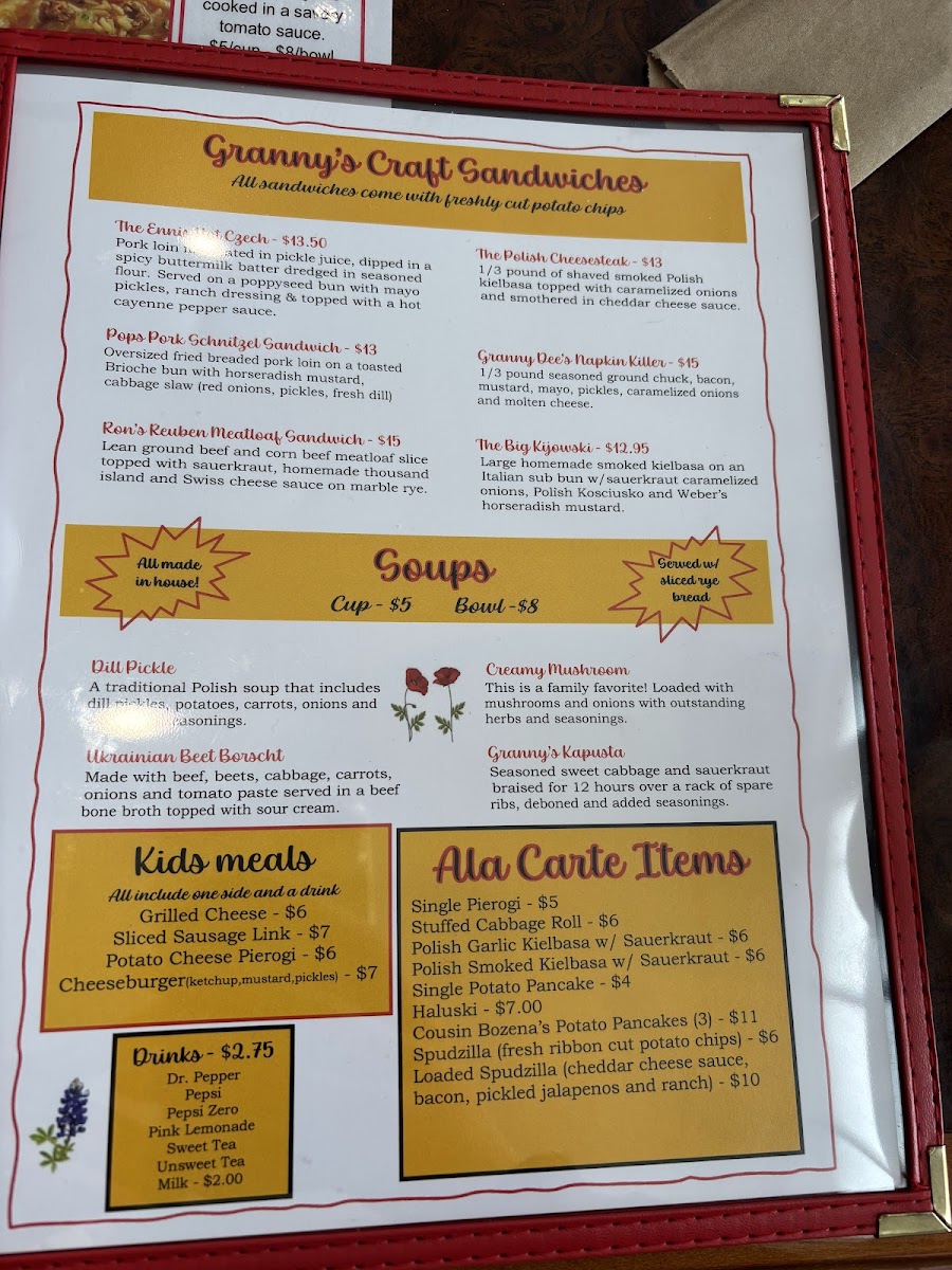 The sandwich lineup under Granny’s Craft Sandwiches adds a modern, indulgent twist, with memorable choices such as Napkin Killer, The Big Kijowski, The Polish Cheesesteak, The Ennis Hot Czech, and Pop’s Pork Schnitzel, all of which reflect bold flavors and comforting textures that pair well with the restaurant’s classic sides. Meanwhile, the soup offerings-Creamy Mushroom Soup, Dill Pickle Soup, Ukrainian Beet Borscht, Kapusta, and Cabbage Roll Soup-round out the menu with depth and variety, ideal for guests seeking something lighter yet still rich in tradition.